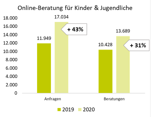 Aus diesen Kontakten entwickelten sich insgesamt 128.524 Beratungen, in denen ein intensives Gespräch mit Kindern, Jugendlichen und Eltern zu ihren Problemen oder Themen geführt wurde. Das sind rund 7% mehr Beratungen als noch in 2019.